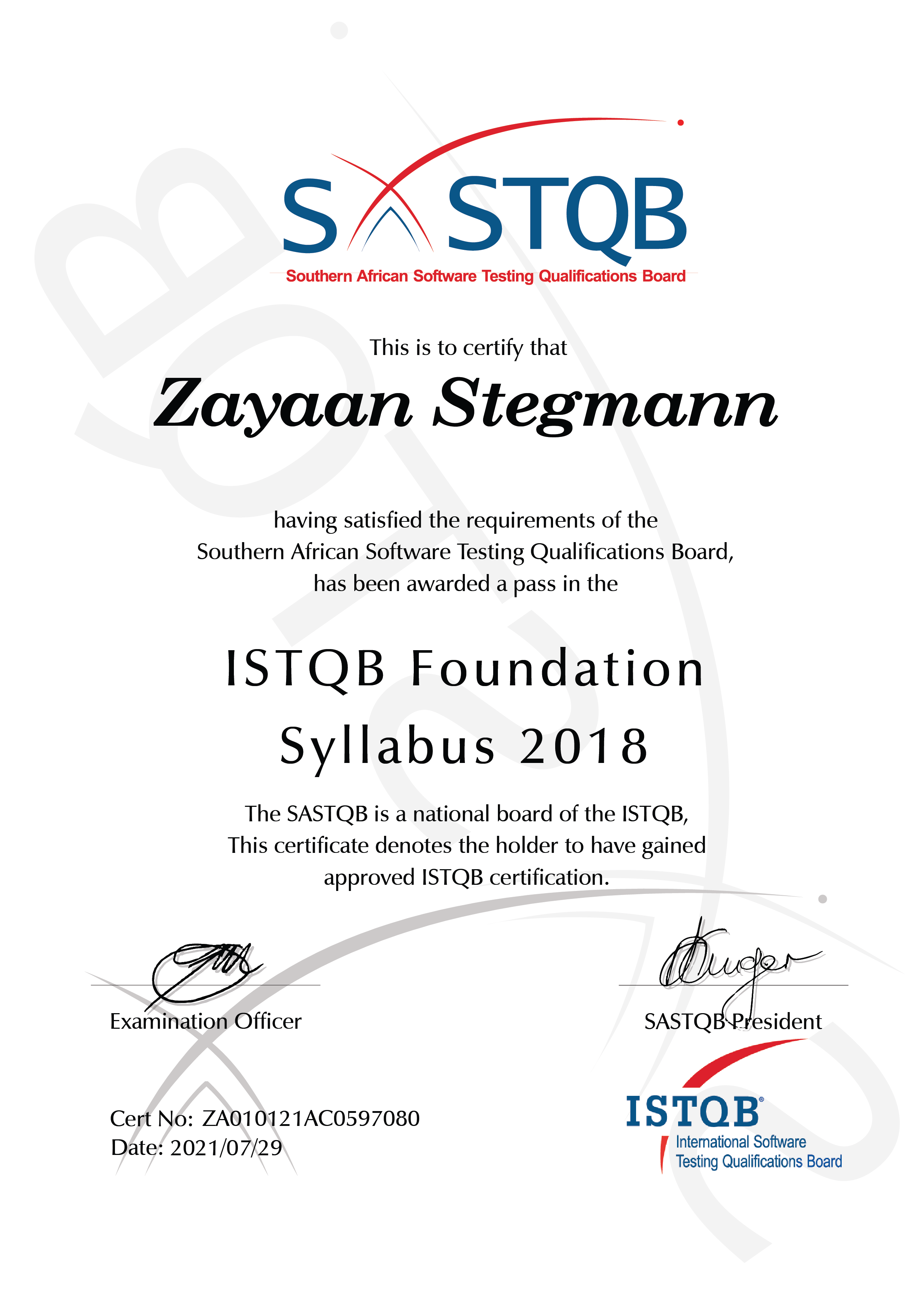 Zayaan Stegmann Software Quality Assurance TestDomeCertificate